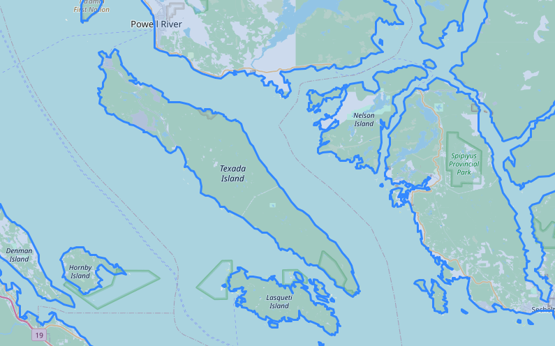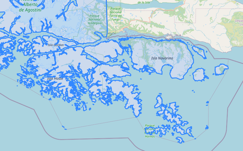 While standards may differ by region, usually, boundaries defined in OpenStreetMap include water (oceans and large lakes). However, OpenStreetMap also defines coastlines for landmasses. Using this data, we calculate land-only polygons for each boundary which removes area extending into the water. Using these, one can for instance produce beautiful static map images. The following table depicts the water and landonly polygons for Chile. Click images to enlarge.